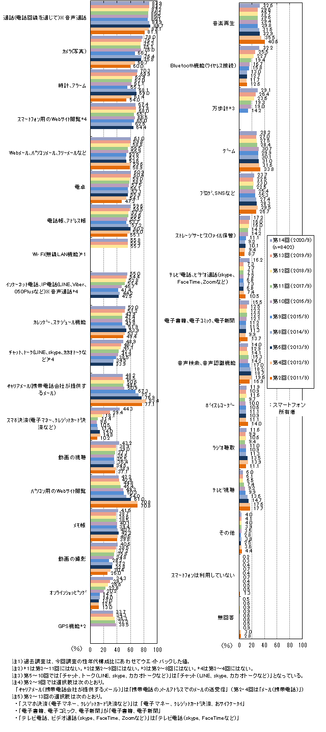 スマートフォン所有者の利用機能・サービスは「通話(電話回線を通じて)」が9割弱、「カメラ(写真)」「時計、アラーム」「スマートフォン用のWebサイト閲覧」が各7~8割、「Webメール、パソコンメール、フリーメールなど」「電卓」「電話帳、アドレス帳」などが各6割前後です。過去調査と比べ、「スマホ決済(電子マネー、クレジットカード決済など)」「オンラインショッピング」「Bluetooth機能(ワイヤレス接続)」などが増加傾向、「パソコン用のWebサイト閲覧」などが減少傾向です。