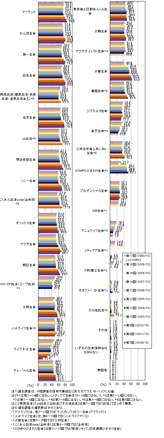 知っている生命保険会社の上位5社は、各7~8割の認知率です。