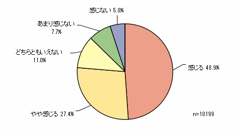 現在運動不足だと感じる人(「感じる」「やや感じる」の合計値)は約76%です。女性の方が比率が高くなっています。