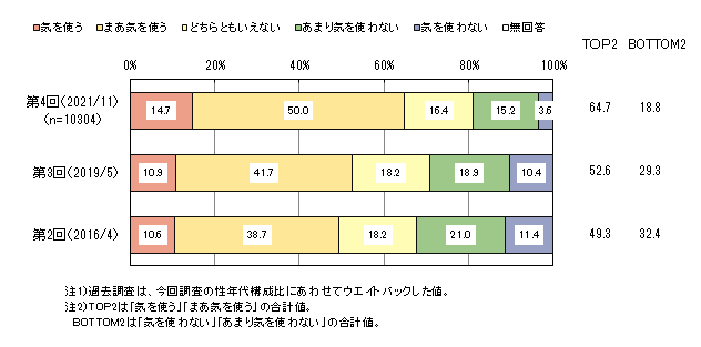 自分の身だしなみに気を使う人(「気を使う」「まあ気を使う」の合計)は64.7%です。男性6割弱、女性約75%です。2019年調査と比べ、増加しています。