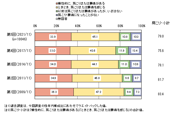 「慢性的に、肩こり・腰痛がある」が33.9%、「ときどき、肩こり・腰痛を感じる」が45.1%で、これらをあわせ、肩こりや腰痛を感じる人は8割弱です。