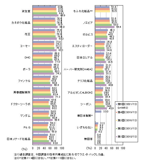 化粧品メーカーとして知っている会社については、上位4社の認知率は70%以上です。