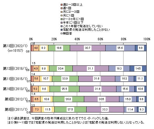 〔(全員)あなたは、この1年間で、宅配便をどのくらいの頻度で発送しましたか。仕事以外での利用についてお聞かせください。〕