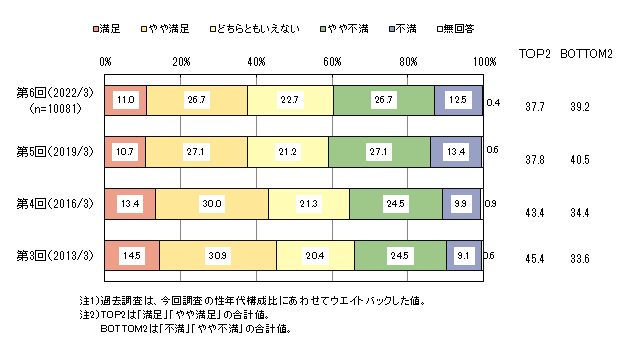 睡眠について満足している人(「満足」「やや満足」の合計)、不満な人(「不満」「やや不満」の合計)はそれぞれ4割弱です。