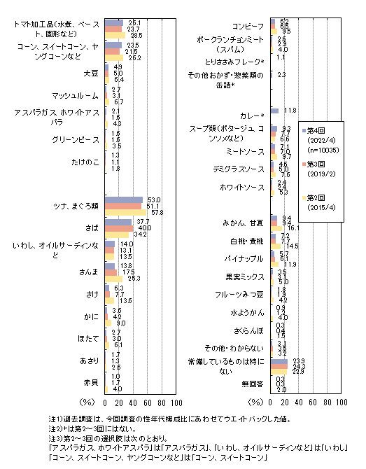 常備している缶詰をたずねたところ、野菜類では「トマト加工品(水煮、ペースト、固形など)」「コーン、スイートコーン、ヤングコーンなど」が各20%台、魚介類では「ツナ、まぐろ類」が53.0%、「さば」が37.7%、「いわし、オイルサーディンなど」「さんま」が各1割強です。