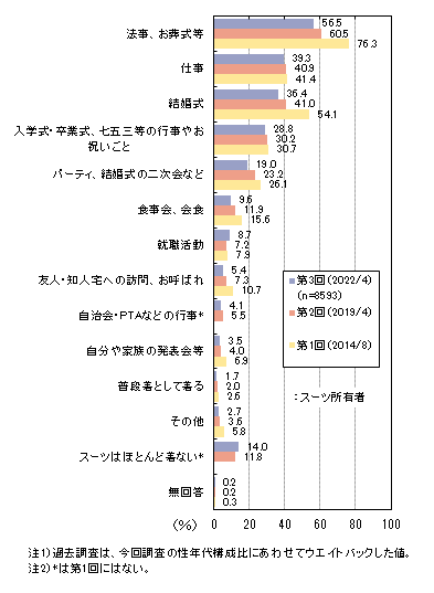 スーツを着る場面は「法事、お葬式等」が、所有者の56.5%、「仕事」「結婚式」が各4割弱、「入学式・卒業式、七五三等の行事やお祝いごと」などが3割弱です。