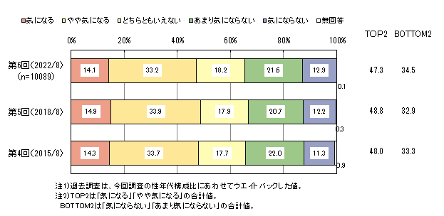 自宅の室内のにおいが気になる人(「気になる」「やや気になる」の合計)は5割弱です。男性4割弱、女性6割弱で、女性の方が比率が高くなっています。特に女性30~40代での比率が高くなっています。