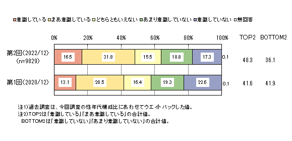 普段の食事に大豆食品を意識して取り入れている人(「意識している」「まあ意識している」の合計)は5割弱、意識して取り入れていない人(「意識していない」「あまり意識していない」の合計)は約36%です。意識して取り入れている人の方がやや多くなっています。