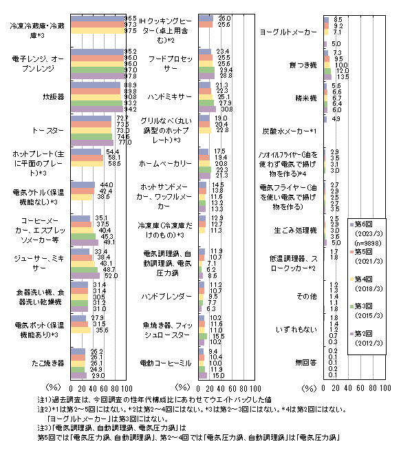 所有キッチン家電は「冷凍冷蔵庫・冷蔵庫」「電子レンジ、オーブンレンジ」「炊飯器」が9割前後、「トースター」が7割強、「ホットプレート(主に平面のプレート)」が5割強、「電気ケトル(保温機能なし)」が4割強、「コーヒーメーカー、エスプレッソメーカー等」「ジューサー、ミキサー」「食器洗い機、食器洗い乾燥機」が各30%台です。過去調査と比べ「ジューサー、ミキサー」「コーヒーメーカー、エスプレッソメーカー等」などが減少傾向です。