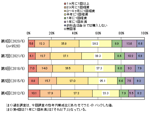 3~4か月に1回以上購入者は全体の4割強です。女性や若年層で比率が高く、購入頻度が高い傾向がうかがえます。女性10・20代では「2ヶ月に1回程度」が3割弱と他の層より高くなっています。