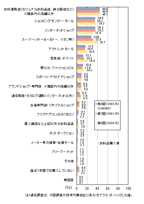衣料品購入者の直近1年間の購入場所は、「衣料量販店(カジュアル衣料品店、紳士服店など)」が44.6%、「ショッピングセンター・モール」「インターネットショップ」が各4割弱、「スーパー(イトーヨーカドー、イオン等)」が3割弱です。2018年調査以降「スーパー(イトーヨーカドー、イオン等)」「百貨店・デパート」などが減少傾向です。