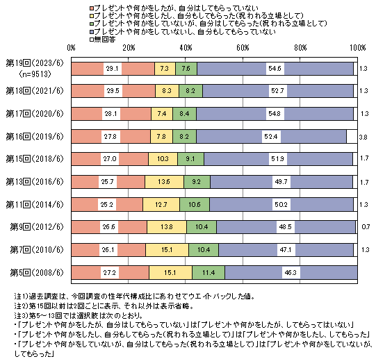 『プレゼントや何かをした』(「プレゼントや何かをしたが、自分はしてもらっていない」+「プレゼントや何かをしたし、自分もしてもらった(祝われる立場として)」)は全体の約36%、『プレゼントや何かをしてもらった』(「プレゼントや何かをしたし、自分もしてもらった(祝われる立場として)」+「プレゼントや何かをしていないが、自分はしてもらった(祝われる立場として)」)は約15%です。