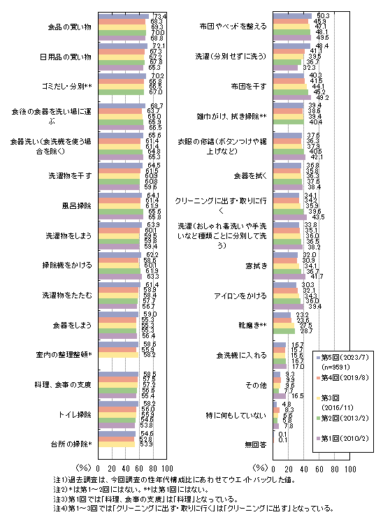全体の数値を過去調査と比べると、「洗濯(分別せずに洗う)」は増加傾向、「洗濯(おしゃれ着洗いや手洗いなど種類ごとに分別して洗う)」は微減傾向です。また、「布団を干す」「アイロンをかける」「靴磨き」などは減少傾向です。
