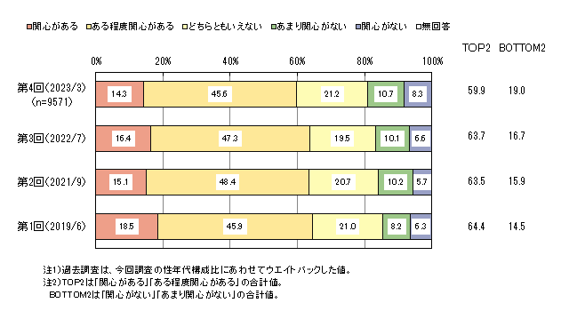 関心がない人(「関心がない」」「あまり関心がない」の合計)は2割弱です。男性30代では約36%で、他の層より比率が高くなっています。