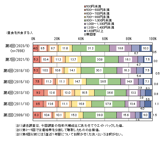 昼食を外食する人の、1回あたりの支出額をたずねたところ、「800~1,000円未満」がボリュームゾーンです。800円以上は7割弱、1000円以上は約36%です。1000円以上の比率は過去調査と比べて最も高く、支出額の増加がうかがえます。