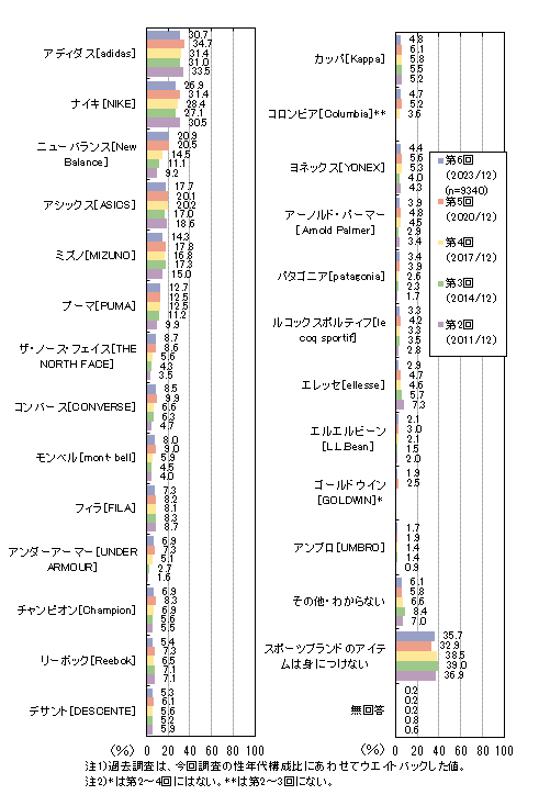 よく身につけるスポーツブランドは「アディダス」が全体の30.7%、「ナイキ」「ニューバランス」が各20%台です。過去調査と比べ「ニューバランス」が増加傾向です。