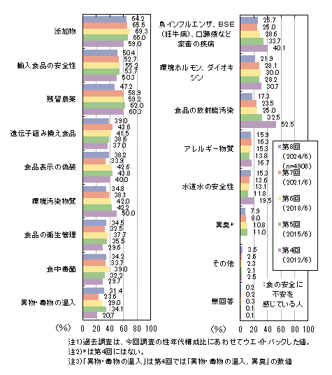 「残留農薬」「添加物」「環境汚染物質」「遺伝子組み換え食品」「食品表示の偽装」「輸入食品の安全性」などは高年代層での比率が高くなっています。