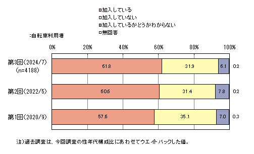 〔(Q1で1~6にお答えの、自転車を利用する方)あなたは、自転車保険や個人賠償責任保険など、自転車事故による相手への損害賠償に対応した保険や特約に加入していますか。※自分以外の家族が契約した家族型の保険の補償対象になっている場合も含みます。〕