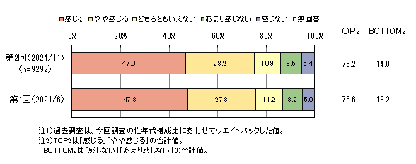 現在運動不足だと感じる人(「感じる」「やや感じる」の合計値)は約75%です。