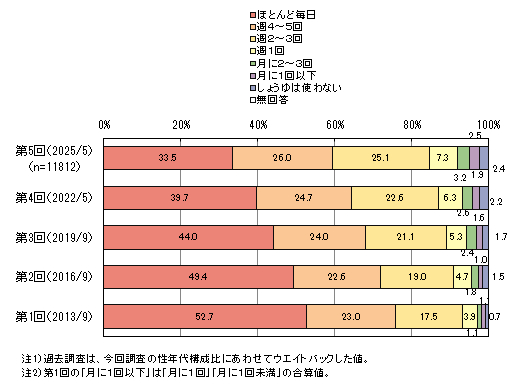 「ほとんど毎日」の比率は高年代層ほど高く、利用頻度が高いことがうかがえます。男性70代では5割弱、女性70代では6割弱ですが、男性10~30代では各1割強、女性10~30代では2割強で、年代差が大きくなっています。