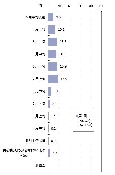 夏を感じはじめる時期は「6月上旬」「6月下旬」「7月上旬」が約17~18%です。