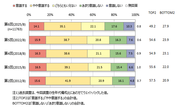 意識しない人(「意識しない」「あまり意識しない」の合計)は3割弱で、男性の方が比率が高くなっています。特に男性30~40代では各4割弱と高くなっています。