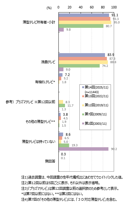 ■薄型テレビ所有者は9割強、2011年以降変化なし。「液晶テレビ」が9割弱、「プラズマテレビ」が1割強。購入予定者は全体の4割弱、薄型テレビ所有者の4~5割、非所有者の2割強。