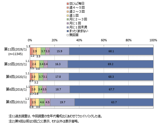 飲用頻度は「月に1回未満」がボリュームゾーンです。週1回以上飲用者は全体の約9%となっています。
