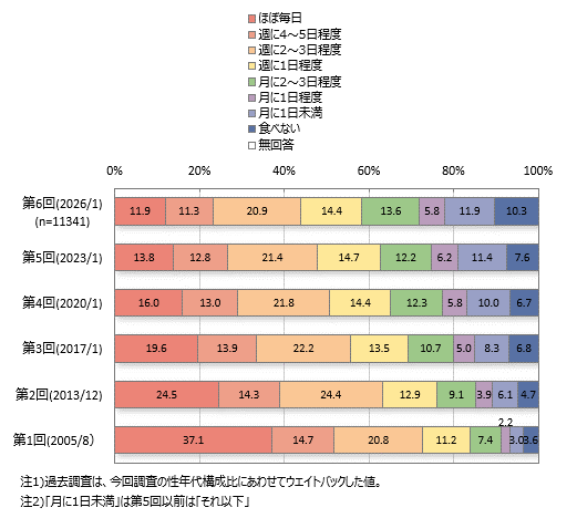 週1日以上食べる人は全体の6割弱で、過去調査と比べ減少傾向です。