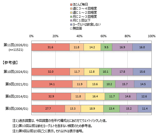 【Q1.(全員)あなたは、ヨーグルトをどれくらいの頻度で飲食していますか。市販のもの、外食、手作りなどをあわせた頻度をお聞かせください(飲むヨーグルトを含む)。※従来のヨーグルト(牛乳由来)についてお答えください。豆乳ヨーグルトなどの植物性ヨーグルトは除きます。】