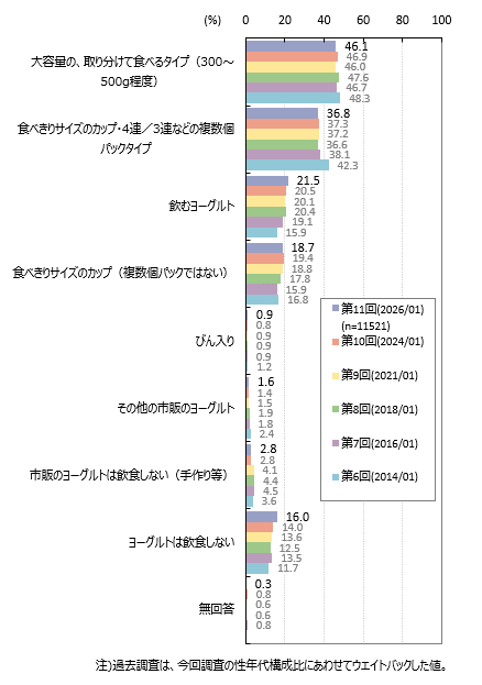 よく飲食する市販のヨーグルトのタイプ(飲むヨーグルト含む)は「大容量の、取り分けて食べるタイプ(300~500g程度)」が全体の46.1%、「食べきりサイズのカップ・4連/3連などの複数個パックタイプ」が36.8%です。「飲むヨーグルト」「食べきりサイズのカップ(複数個パックではない)」が各2割前後となっています。