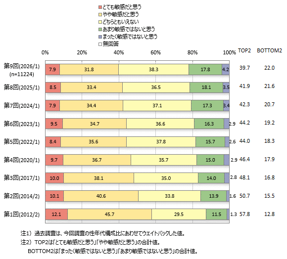 味覚に対して敏感な人(「とても敏感だと思う」「やや敏感だと思う」の合計)は、全体の4割弱です。