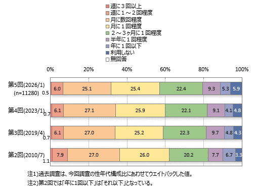 月1回以上利用者は、全体の6割弱です。男性5割強、女性6割強で、女性の方が頻度が高い傾向です。