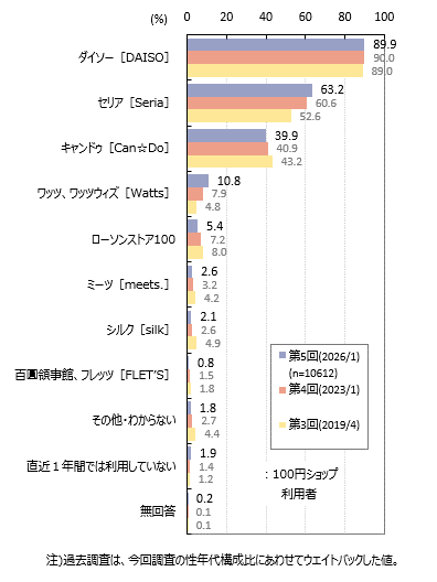 100円ショップ利用者が直近1年間に利用した100円ショップは、「ダイソー」が89.9%、「セリア」が63.2%、「キャンドゥ」が39.9%です。