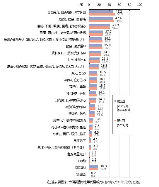 心身についての症状では「目の疲れ、目の痛み、かすみ目」「肩こり、腰痛、関節痛」が各5割弱、「便秘・下痢、軟便、腹痛、おなかが張る」が41.9%、「胃痛、胃もたれ、吐き気など胃の状態」「睡眠の質が悪い(眠れない、眠りが浅い、夜中に目が覚めるなど)」「頭痛、頭が重い」が各3割弱です。