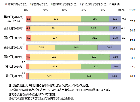 2025年の生活について満足できた人(「非常に満足できた」「まあ満足できた」の合計)は全体の6割弱です。