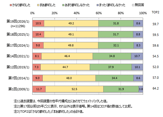 昨年1年間経費を節約した人(「かなり節約した」「まあ節約した」の合計)は6割弱です。2024年調査以降、ほぼ同率となっています。女性50代での比率がやや高くなっています。