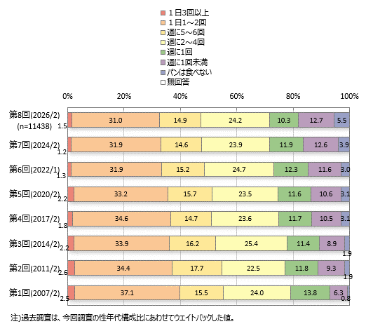 パンを食べる頻度は、「1日1~2回」がボリュームゾーンです。