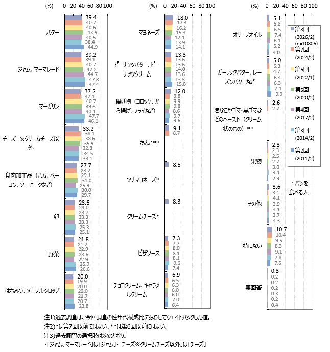 パンを食べる人が、パンに塗る・はさむ・のせるものは「バター」「ジャム、マーマレード」「マーガリン」が各4割弱、「チーズ ※クリームチーズ以外」が3割強、「食肉加工品(ハム、ベーコン、ソーセージなど)」「卵」「野菜」「はちみつ、メープルシロップ」が各20%台です。