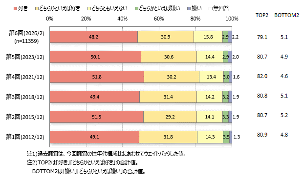 「好き」という強い嗜好度の比率は半数弱を占めます。男性は高年代層ほど比率が高く、70代では55%ですが10~30代では各3割前後と低く、年代差が大きくなっています。女性は30代での比率が最も低く、それ以降年代が高いほど比率が高い傾向です。女性70代では7割弱と特に高くなっています。