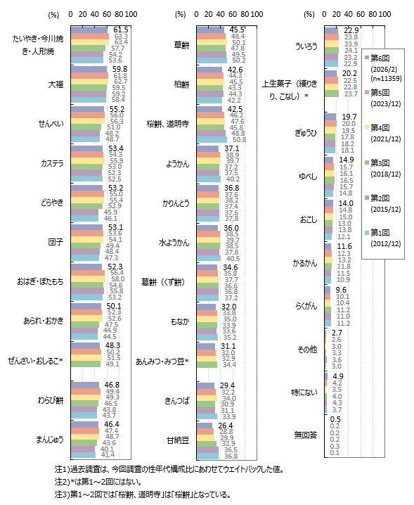 好きな和菓子の種類は「たいやき・今川焼き・人形焼」61.5%、「大福」59.8%、「せんべい」55.2%です。「カステラ」「どらやき」「団子」「おはぎ・ぼたもち」「あられ・おかき」が各5割強で続きます。