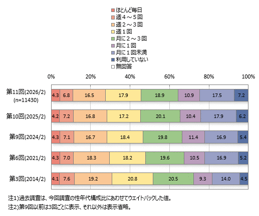 女性では若年層ほど利用頻度が高い傾向で、年代差が大きくなっています。週1回以上利用者は女性10・20代では半数弱ですが、女性70代では2割強にとどまっています。