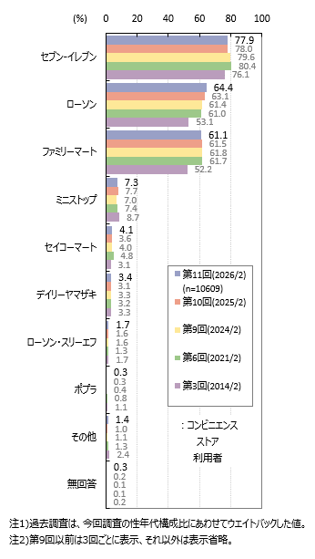 コンビニエンスストア利用者がよく利用する店舗は、「セブン‐イレブン」77.9%、「ローソン」「ファミリーマート」各6割強です。