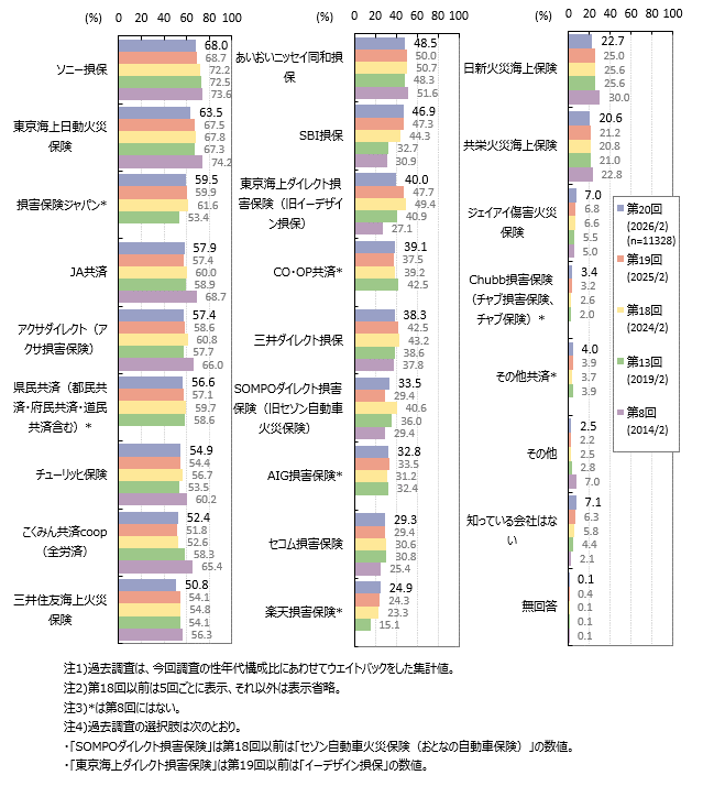 損保会社の認知率は、「ソニー損保」が68.0%、「東京海上日動火災保険」が63.5%、「損害保険ジャパン」「JA共済」「アクサダイレクト(アクサ損害保険)」「県民共済(都民共済・府民共済・道民共済含む)」などが各6割弱です。