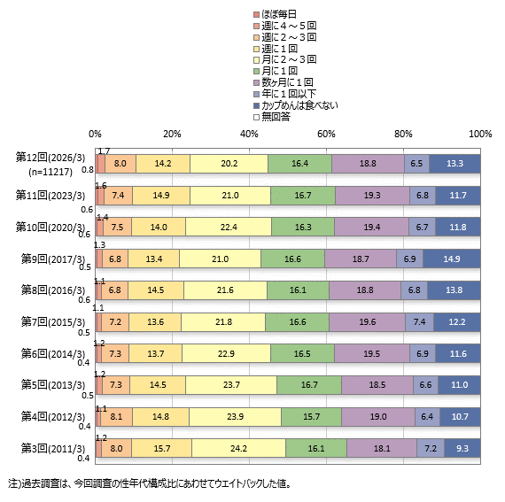 カップめんを食べる人は全体の9割弱です。前回と比べて大きな変化はみられません。