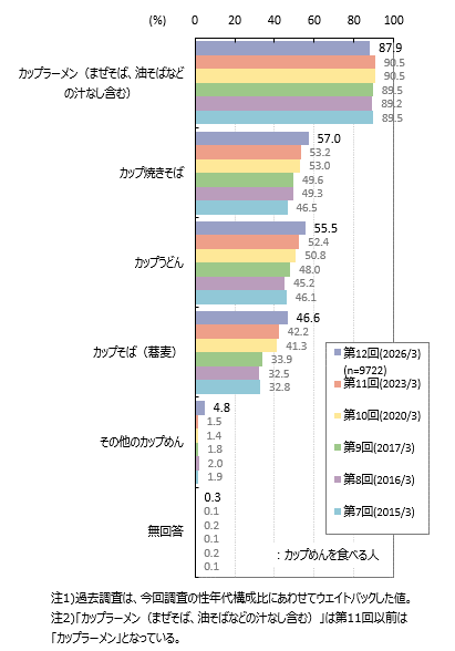 カップめんを食べる人が普段食べるタイプは「カップラーメン」が87.9%、「カップ焼きそば」「カップうどん」が各5割台半ば~後半、「カップそば」が5割弱です。過去調査と比べ「カップうどん」「カップそば」などが増加傾向です。