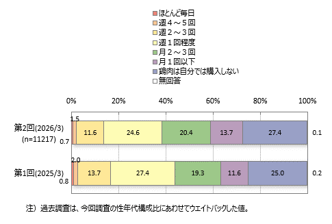 【Q1.(全員)あなたは鶏肉をどのくらいの頻度で購入しますか。直近1年間での購入頻度をお聞かせください。※加工肉(ハム、ソーセージ、サラダチキンなど)や鶏肉加工品・惣菜は除く】