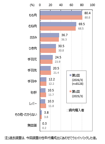 鶏肉購入者が普段購入する部位は「もも肉」80.4%、「むね肉」69.5%、「ささみ」36.7%、「ひき肉」30.5%です。