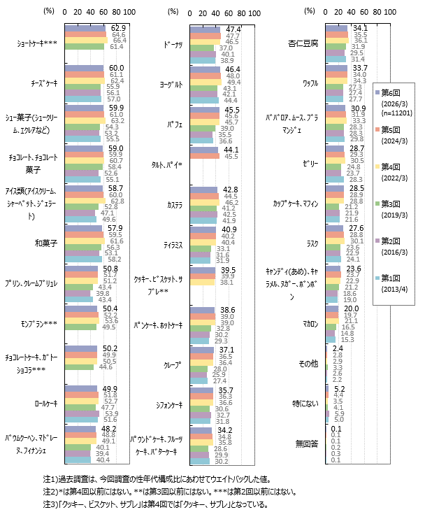 好きなスイーツ・デザート類は「ショートケーキ」「チーズケーキ」が各6割強、「シュー菓子(シュークリーム、エクレアなど)」「チョコレート、チョコレート菓子」「アイス類(アイスクリーム、シャーベット、ジェラート)」「和菓子」が各6割弱です。