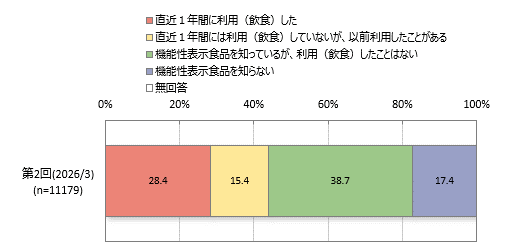機能性表示食品直近1年間利用者(「直近1年間に利用(飲食)した」)は28.4%です。これに「直近1年間には利用(飲食)していないが、以前利用したことがある」(15.4%)をあわせた機能性表示食品利用経験者の比率は、4割強です。また、これらに「機能性表示食品を知っているが、利用(飲食)したことはない」(38.7%)をあわせた、機能性表示食品の認知率(知っている人の合計)は8割強です。